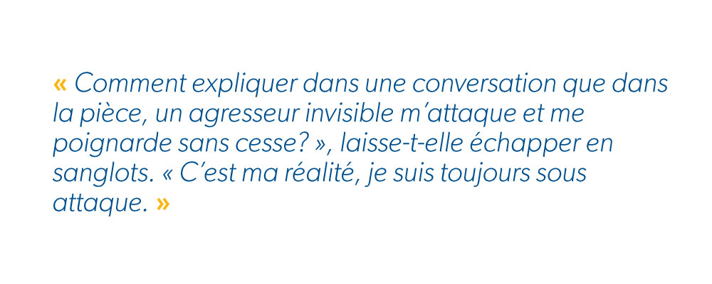 Elle est épuisée et la douleur la vide émotionnellement, ce qui entraîne des répercussions sur sa santé mentale, sa vie sociale et ses relations. « Il m’arrive souvent de me réveiller au milieu de la nuit et de trouver mon oreiller mouillé parce que j’ai pleuré dans mon sommeil ».