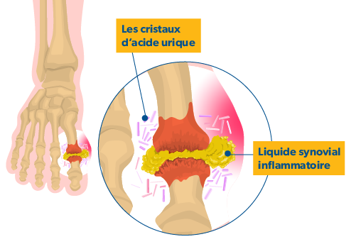 Les crises de goutte ne peuvent survenir que s’il y a des cristaux d’acide urique dans l’articulation, ce qui se produit uniquement lorsqu’il y a trop d’acide urique dans le sang.