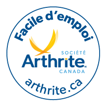 Le logo Facile d’emploi indique simplement que le produit est facile d’emploi, mais il n’indique pas la reconnaissance de ses propriétés thérapeutiques, et l’approbation ne constitue pas une recommandation du produit dans son ensemble. Après la certification du produit, ses fabricants font une contribution annuelle à la mission de la Société de l’arthrite du Canada pour combattre le feu de l’arthrite par la recherche, la défense de la cause, l’innovation, l’information et le soutien.