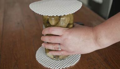 Un ouvre bocal soulève légèrement le couvercle des pots scellés sous vide pour qu’il soit plus facile à desserrer. Placer un tapis antidérapant sous le bocal diminue l’effort requis pour tenir le bocal en place et réduit la tension subie par vos articulations et muscles de la main.
